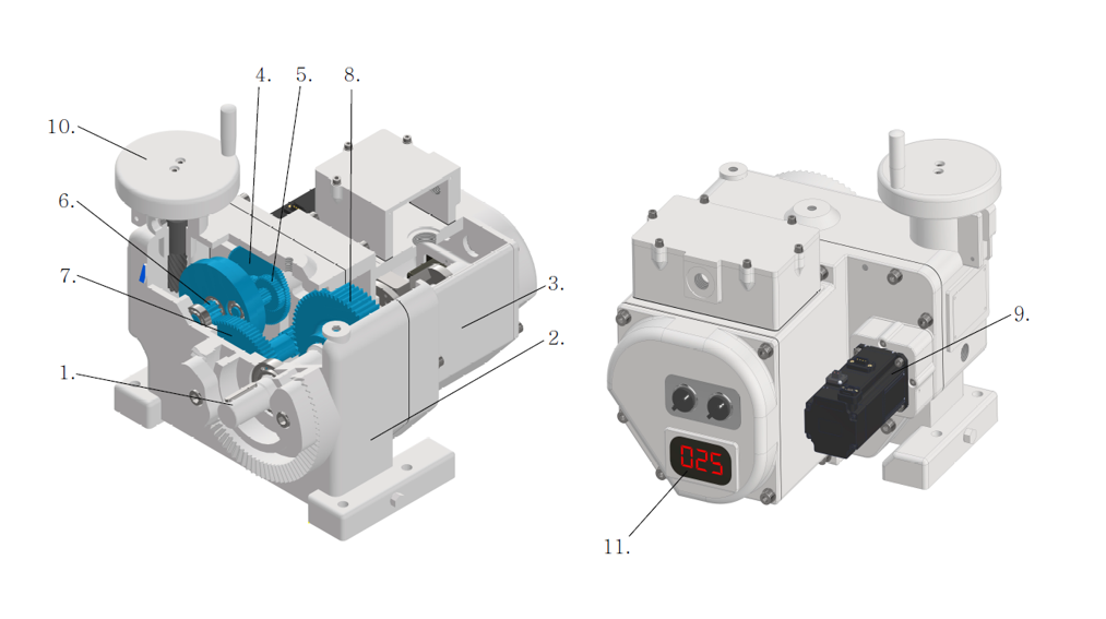 - 서보모터, 감속장치, 수동핸들, 컨트롤 등으로 구성되어 있고, 관리 및 유지보수가 용이합니다.